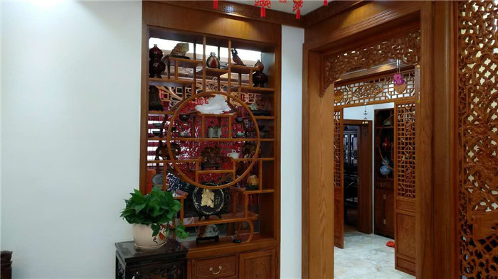 • ▲ 入户无玄关,开放式的客厅和餐厅空间,端景是一个蓝色的仿古多斗柜 ▲ 电视背景中间是花鸟壁纸,两侧是中式雕花隔断,隐形门毫无破绽 山西郜氏精装建筑工程有限公司,简称“郜氏精装”,成立于2017年,注册资金200万元,前身为北京中...